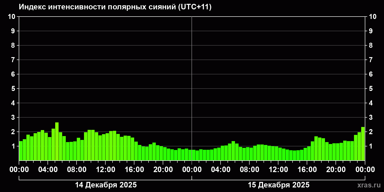 Изменения индекса интенсивности полярных сияний с 2025-12-14 по 2025-12-15 по местному времени