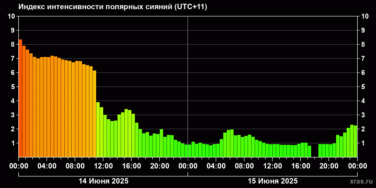 Изменения индекса интенсивности полярных сияний с 2025-06-14 по 2025-06-15 по местному времени