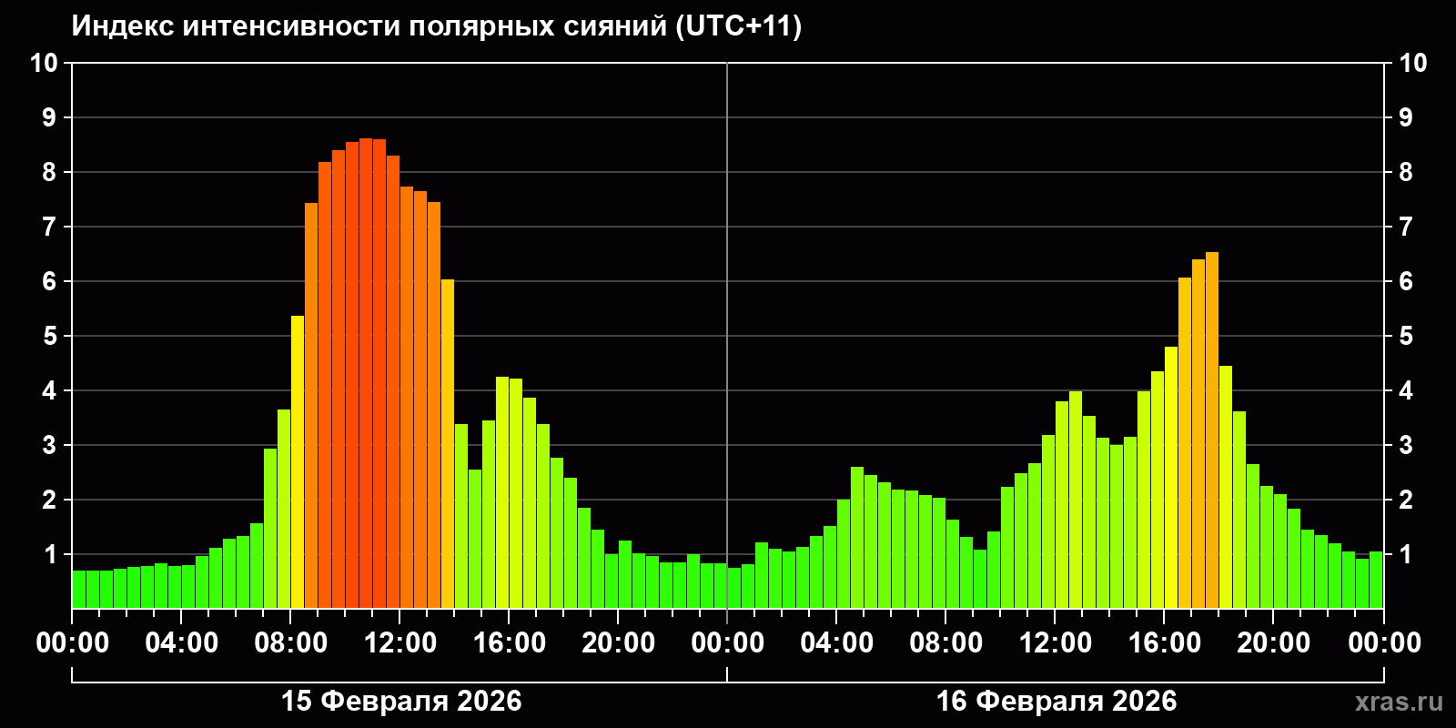 Изменения индекса интенсивности полярных сияний с 2026-02-15 по 2026-02-16 по местному времени
