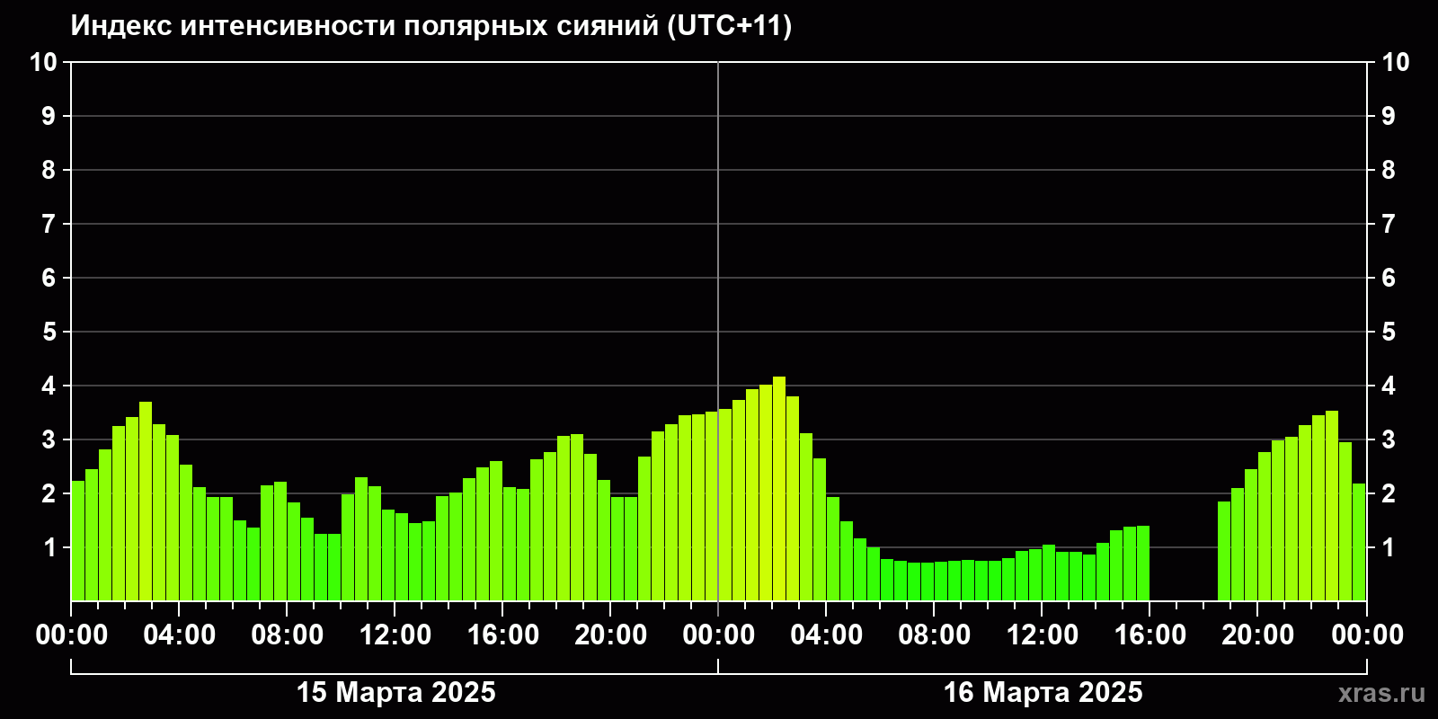 Изменения индекса интенсивности полярных сияний с 2025-03-15 по 2025-03-16 по местному времени