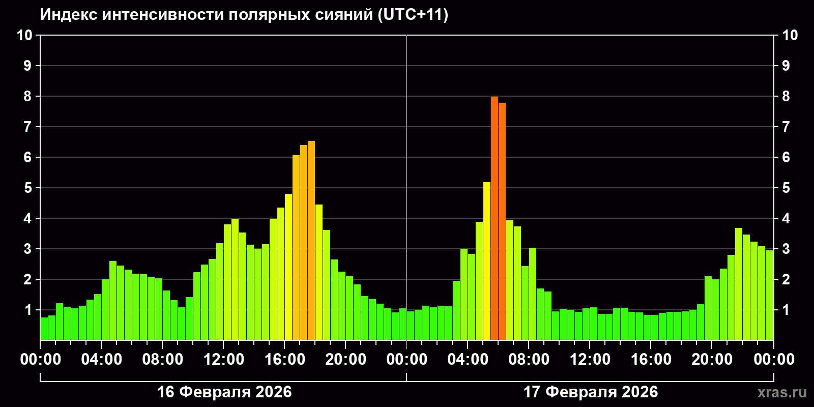 Изменения индекса интенсивности полярных сияний с 2026-02-16 по 2026-02-17 по местному времени