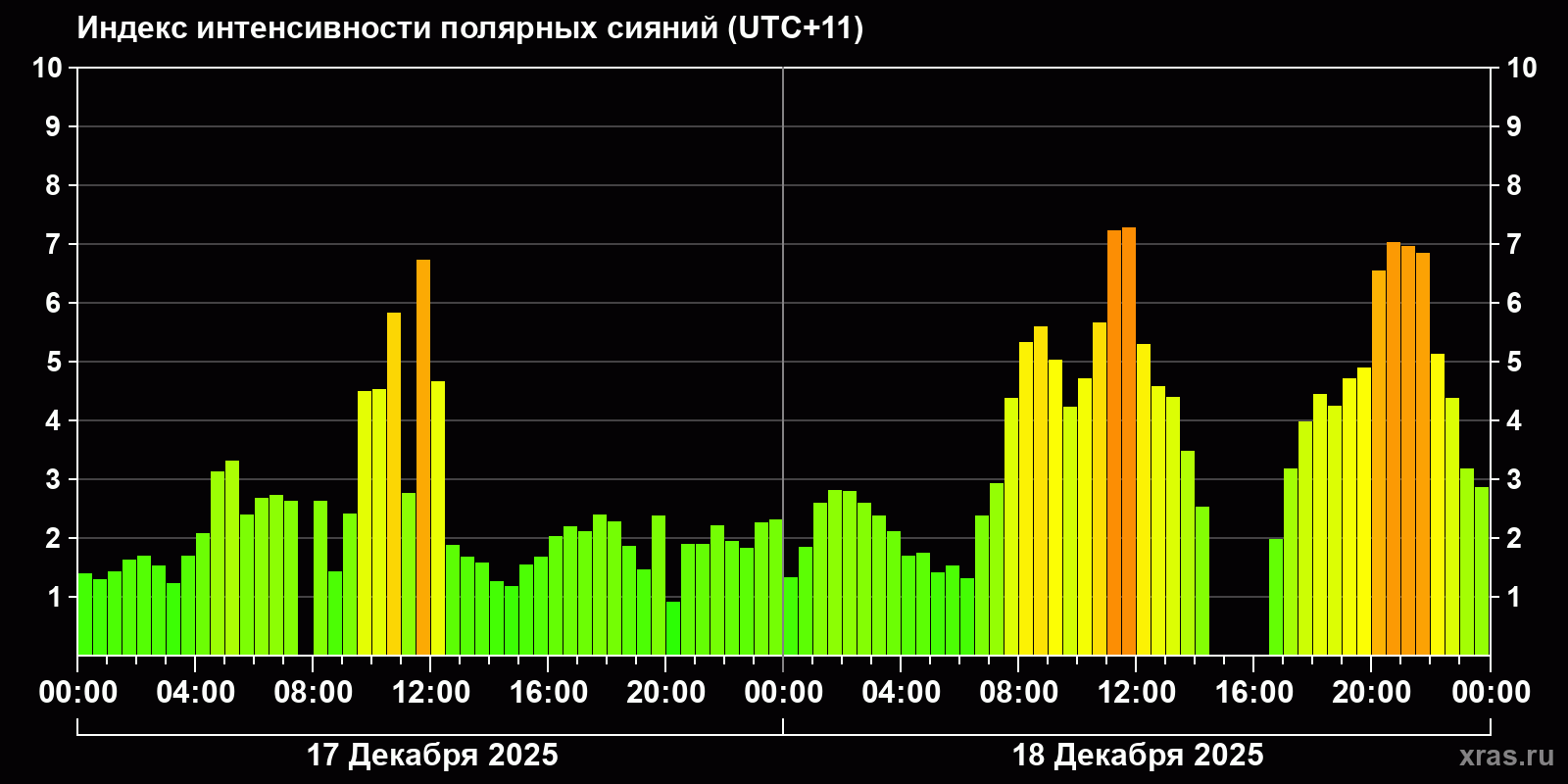 Изменения индекса интенсивности полярных сияний с 2025-12-17 по 2025-12-18 по местному времени