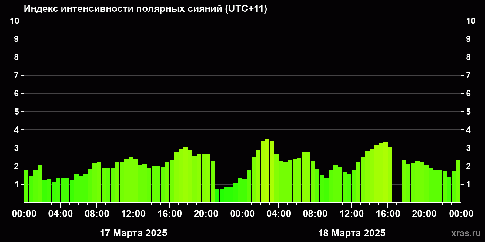 Изменения индекса интенсивности полярных сияний с 2025-03-17 по 2025-03-18 по местному времени