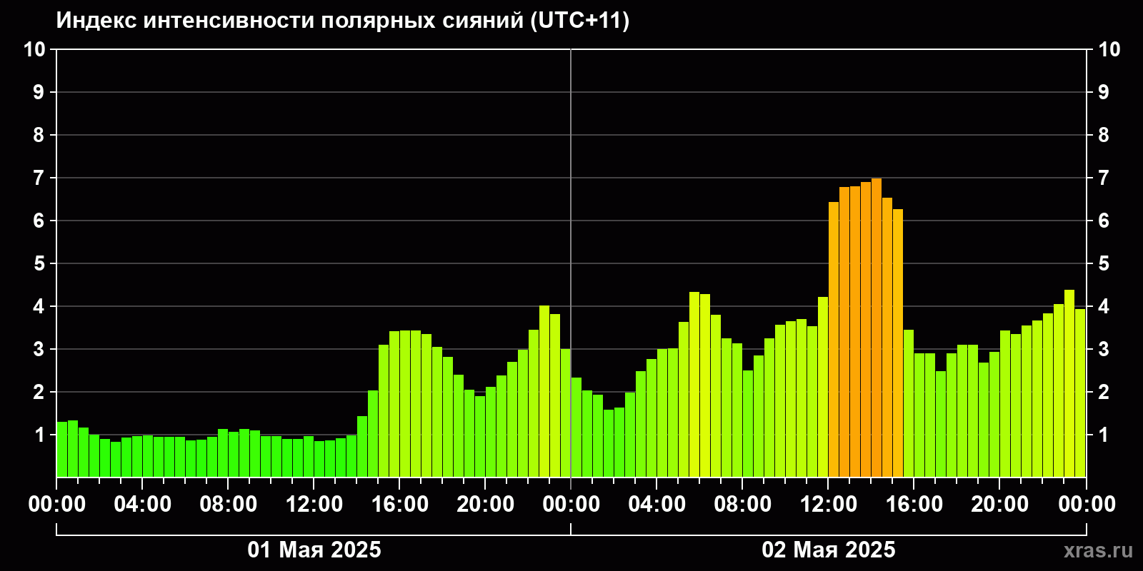 Изменения индекса интенсивности полярных сияний с 2025-05-01 по 2025-05-02 по местному времени