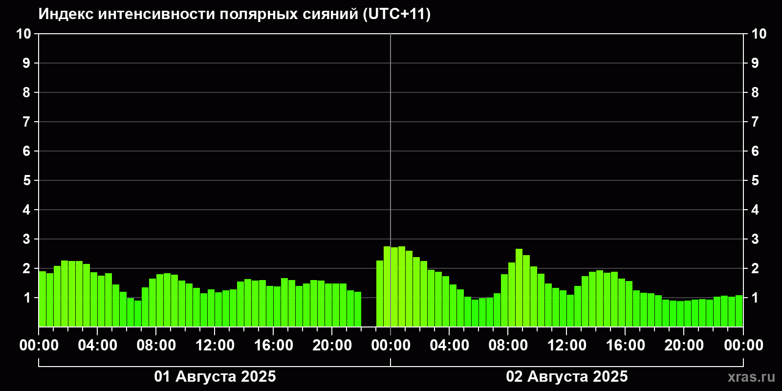 Изменения индекса интенсивности полярных сияний с 2025-08-01 по 2025-08-02 по местному времени