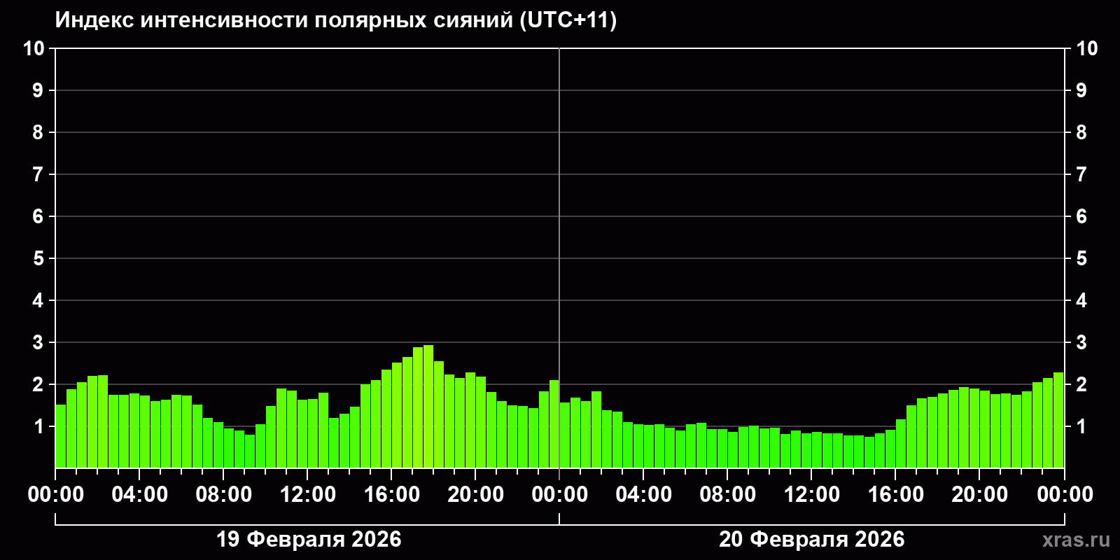 Изменения индекса интенсивности полярных сияний с 2026-02-19 по 2026-02-20 по местному времени