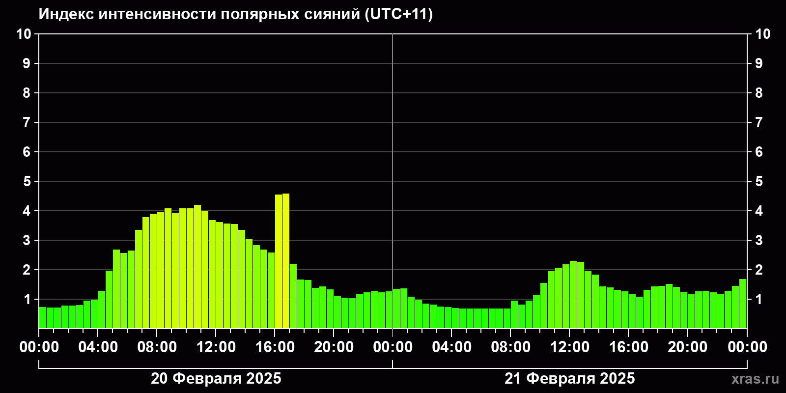 Изменения индекса интенсивности полярных сияний с 2025-02-20 по 2025-02-21 по местному времени