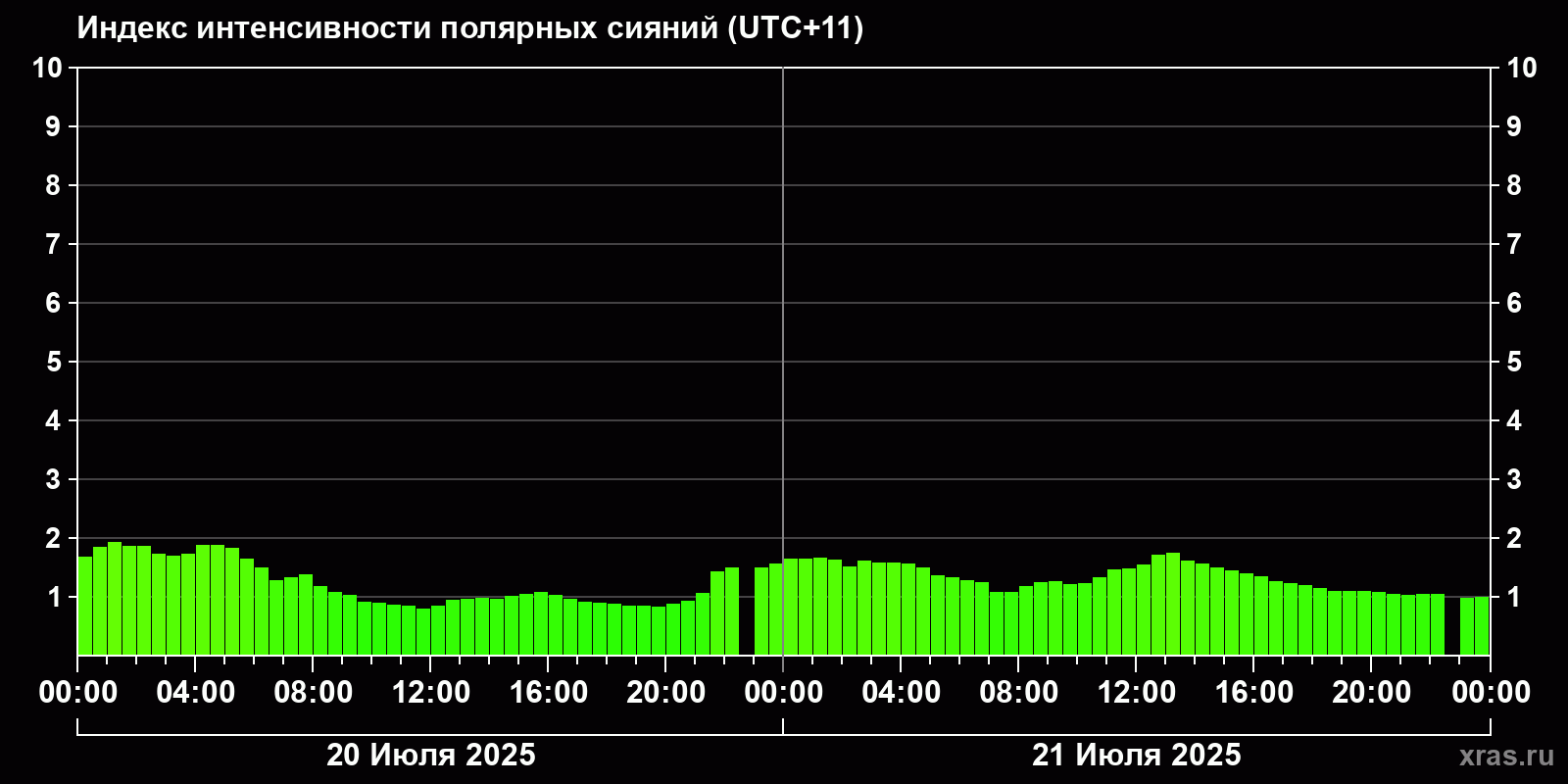 Изменения индекса интенсивности полярных сияний с 2025-07-20 по 2025-07-21 по местному времени