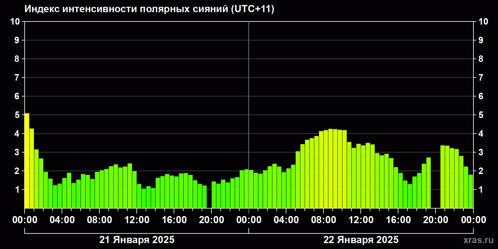 Изменения индекса интенсивности полярных сияний с 2025-01-21 по 2025-01-22 по местному времени