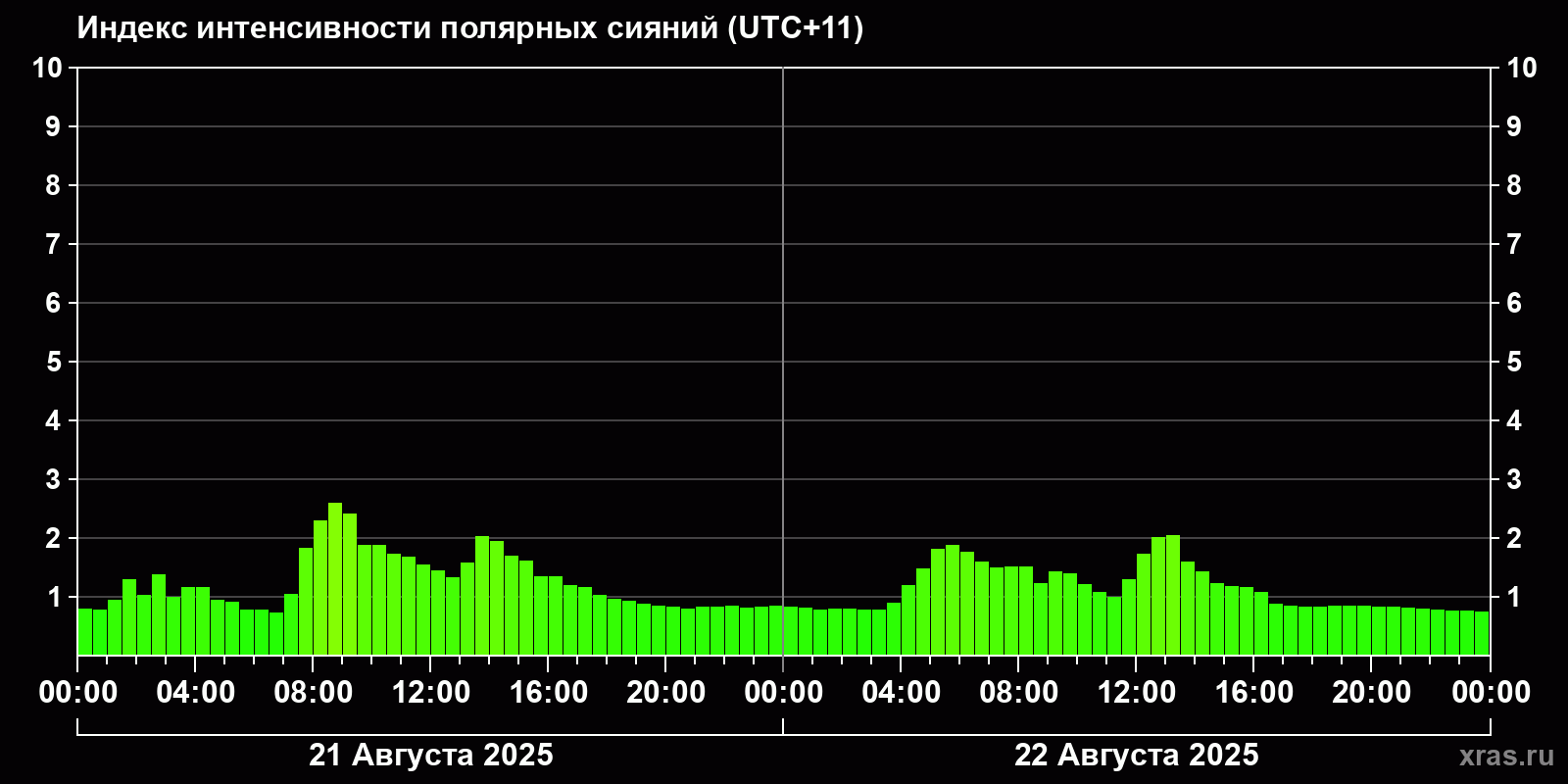 Изменения индекса интенсивности полярных сияний с 2025-08-21 по 2025-08-22 по местному времени