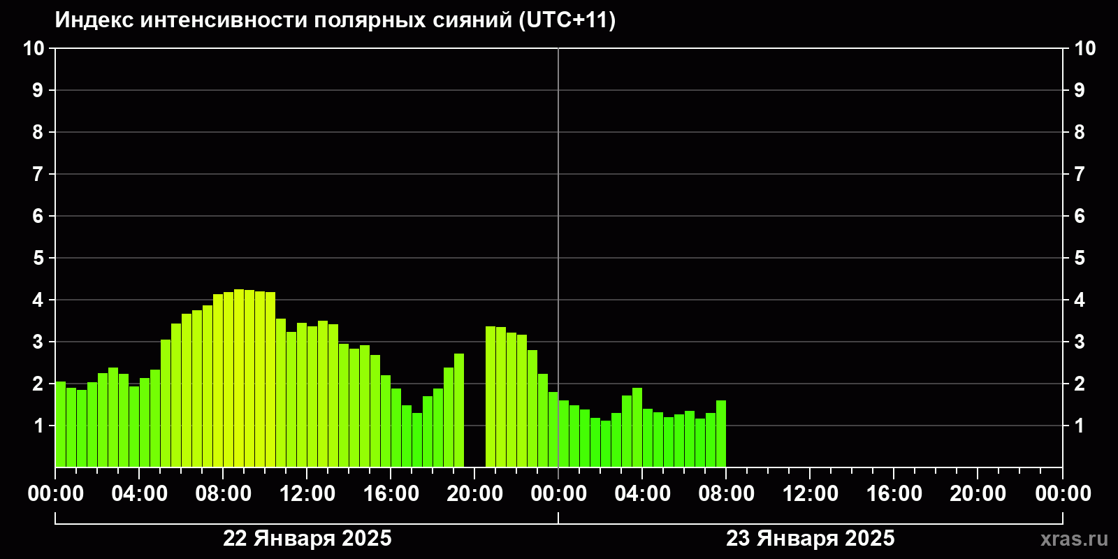 Изменения индекса интенсивности полярных сияний с 2025-01-22 по 2025-01-23 по местному времени
