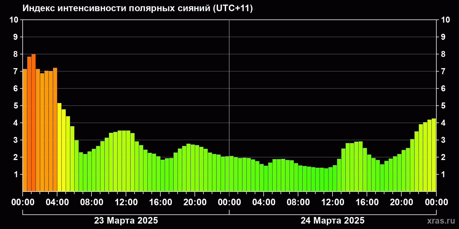 Изменения индекса интенсивности полярных сияний с 2025-03-23 по 2025-03-24 по местному времени