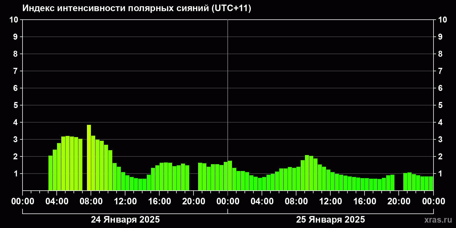 Изменения индекса интенсивности полярных сияний с 2025-01-24 по 2025-01-25 по местному времени