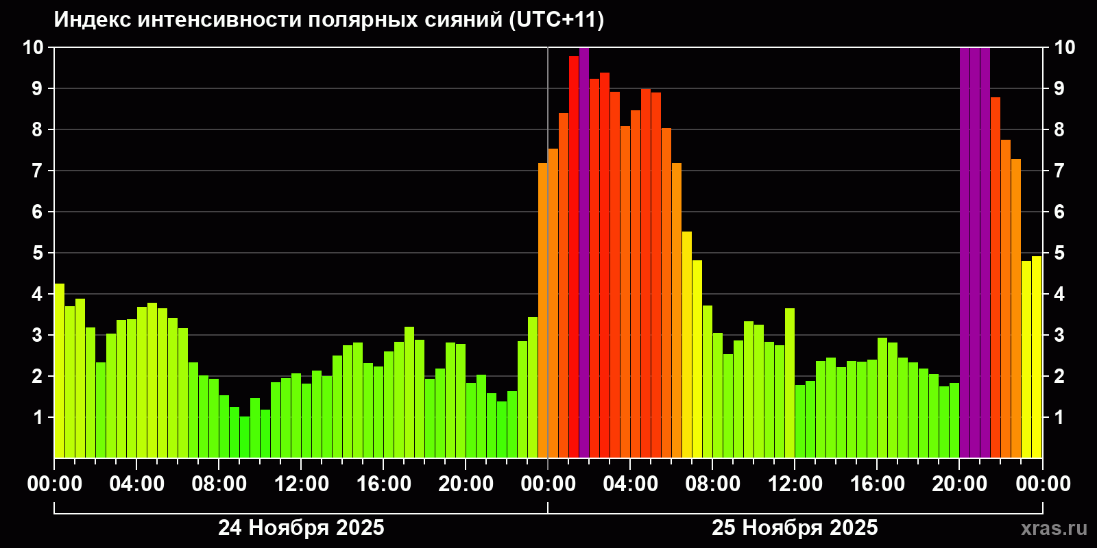 Изменения индекса интенсивности полярных сияний с 2025-11-24 по 2025-11-25 по местному времени
