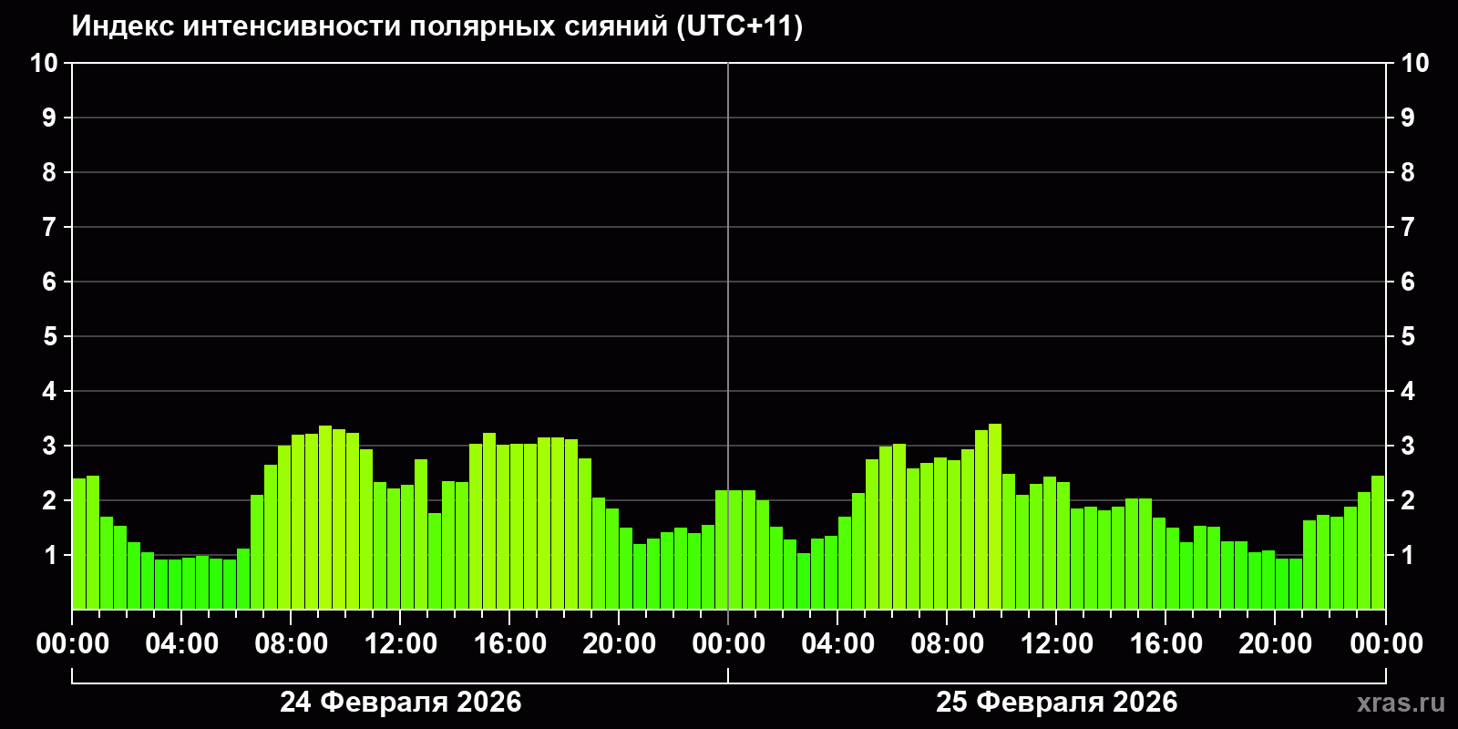 Изменения индекса интенсивности полярных сияний с 2026-02-24 по 2026-02-25 по местному времени