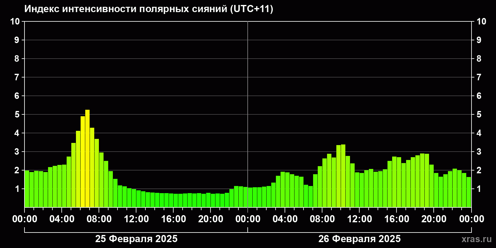 Изменения индекса интенсивности полярных сияний с 2025-02-25 по 2025-02-26 по местному времени