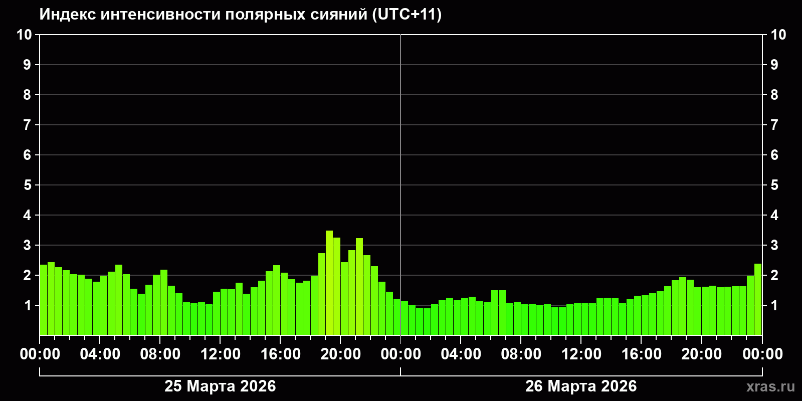 Изменения индекса интенсивности полярных сияний с 2026-03-25 по 2026-03-26 по местному времени