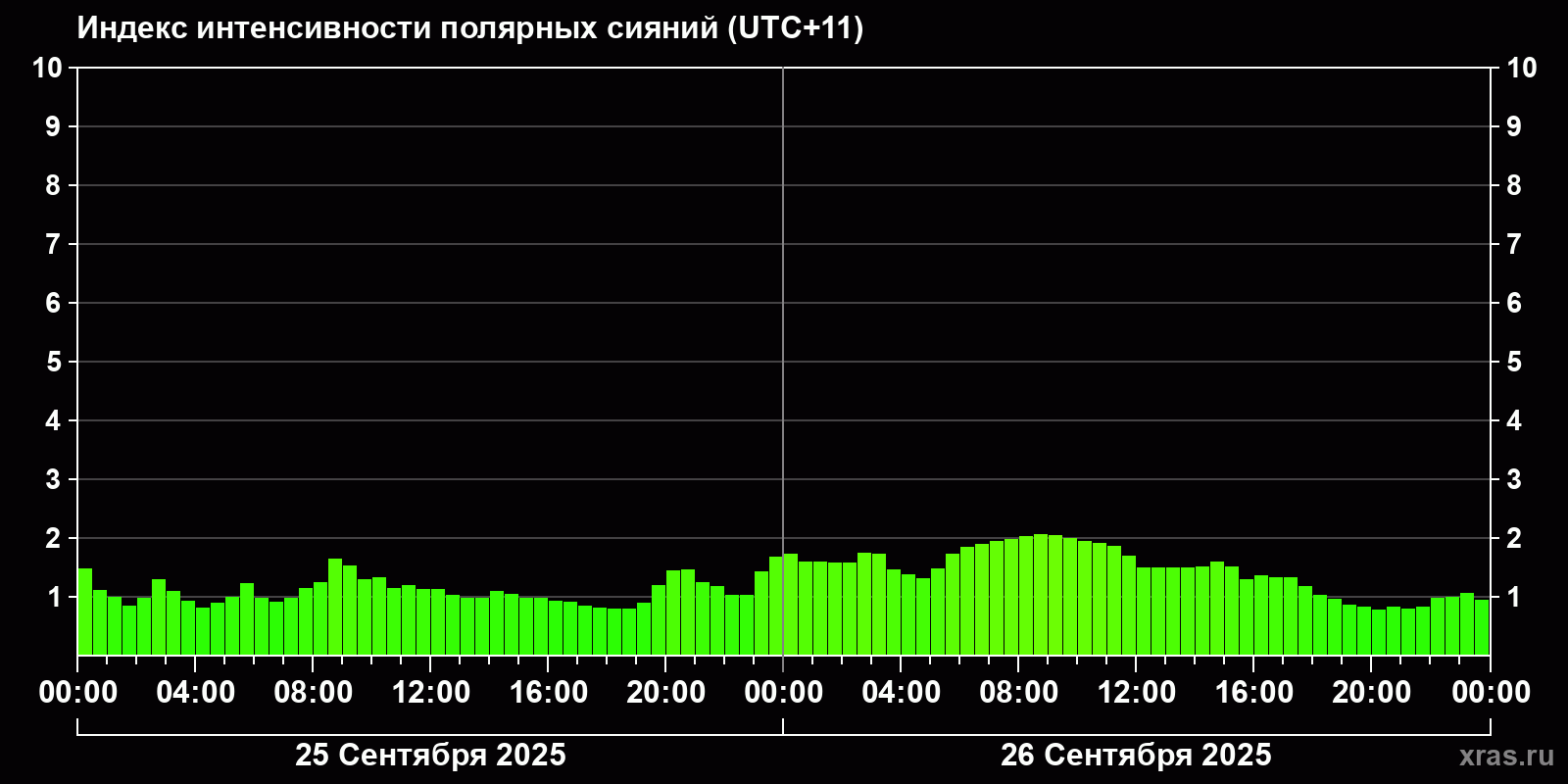 Изменения индекса интенсивности полярных сияний с 2025-09-25 по 2025-09-26 по местному времени