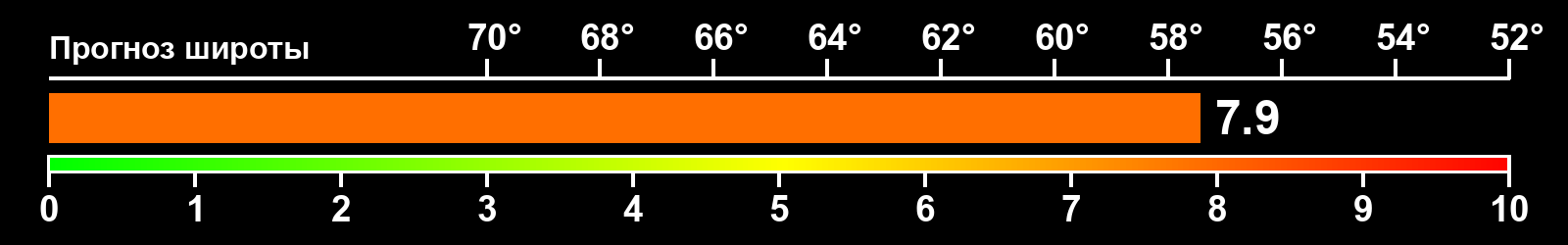 Индекс интенсивности полярных сияний и теоретически возможная широта наблюдений для ночного времени в восточном полушарии по состоянию на 2025-11-27 23:45 (конец дня) по местному времени