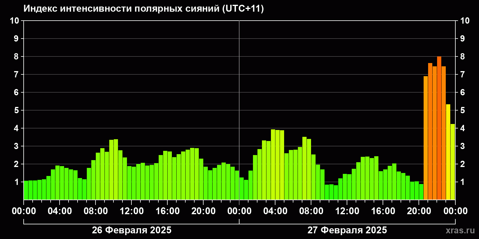 Изменения индекса интенсивности полярных сияний с 2025-02-26 по 2025-02-27 по местному времени