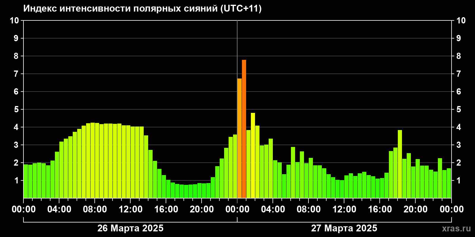 Изменения индекса интенсивности полярных сияний с 2025-03-26 по 2025-03-27 по местному времени