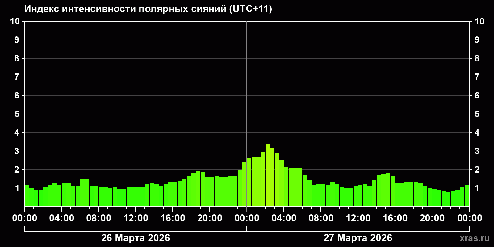Изменения индекса интенсивности полярных сияний с 2026-03-26 по 2026-03-27 по местному времени