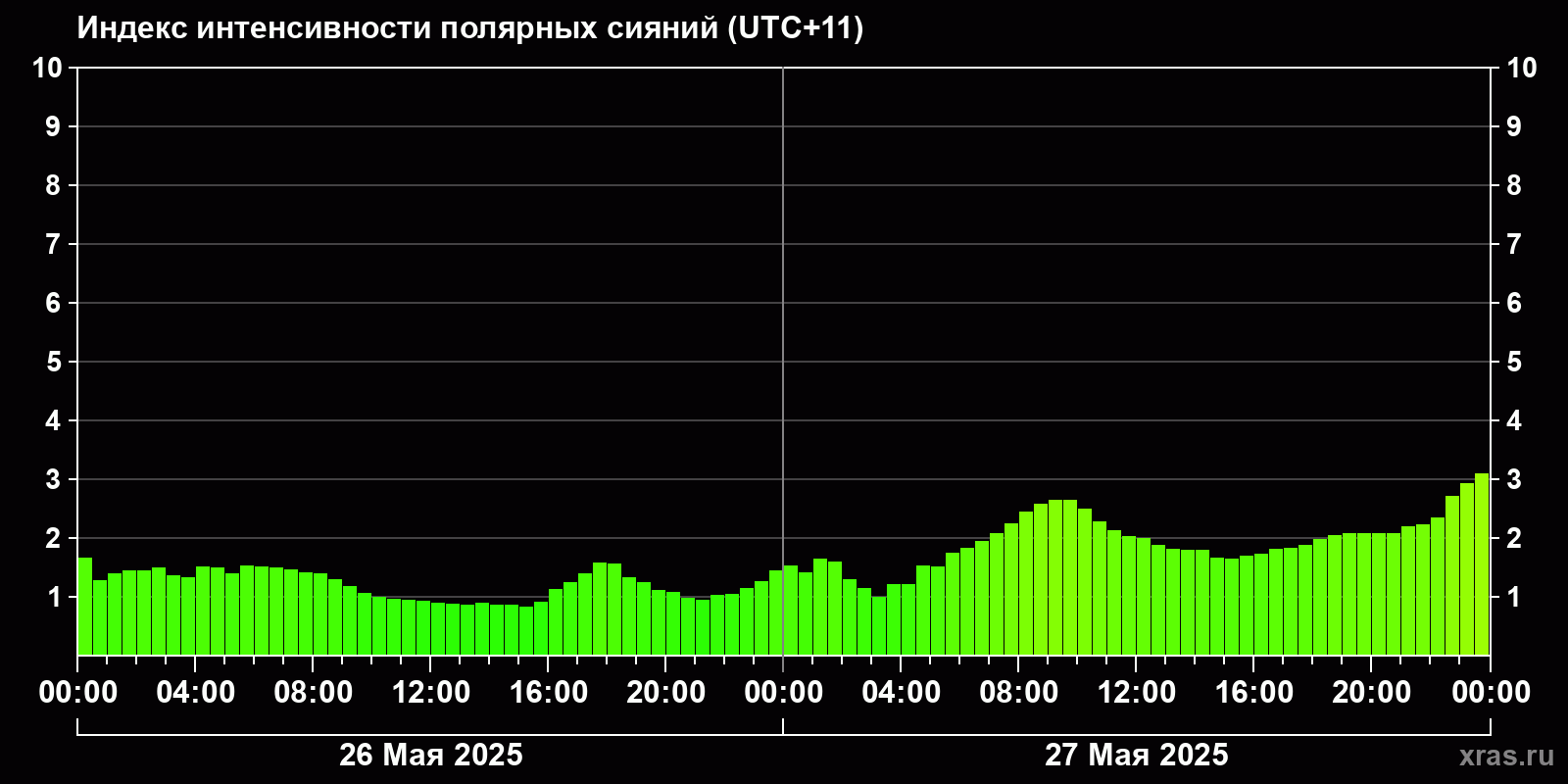 Изменения индекса интенсивности полярных сияний с 2025-05-26 по 2025-05-27 по местному времени