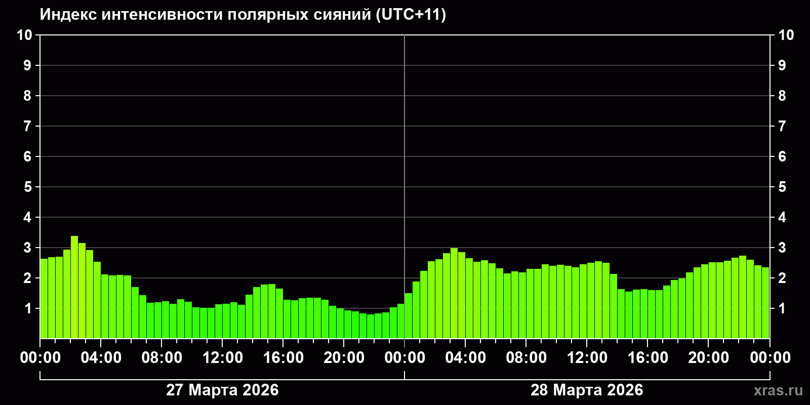 Изменения индекса интенсивности полярных сияний с 2026-03-27 по 2026-03-28 по местному времени