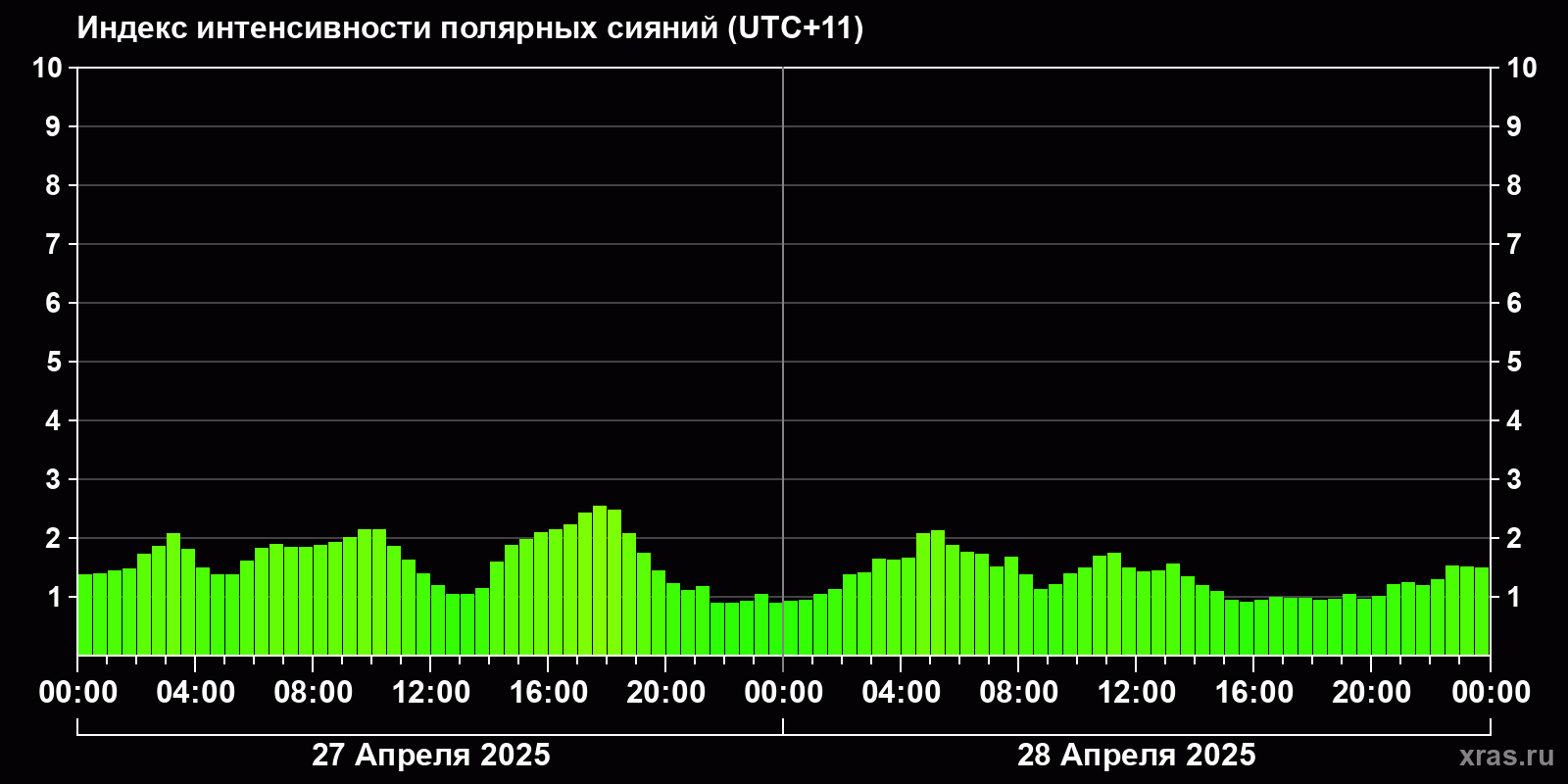 Изменения индекса интенсивности полярных сияний с 2025-04-27 по 2025-04-28 по местному времени