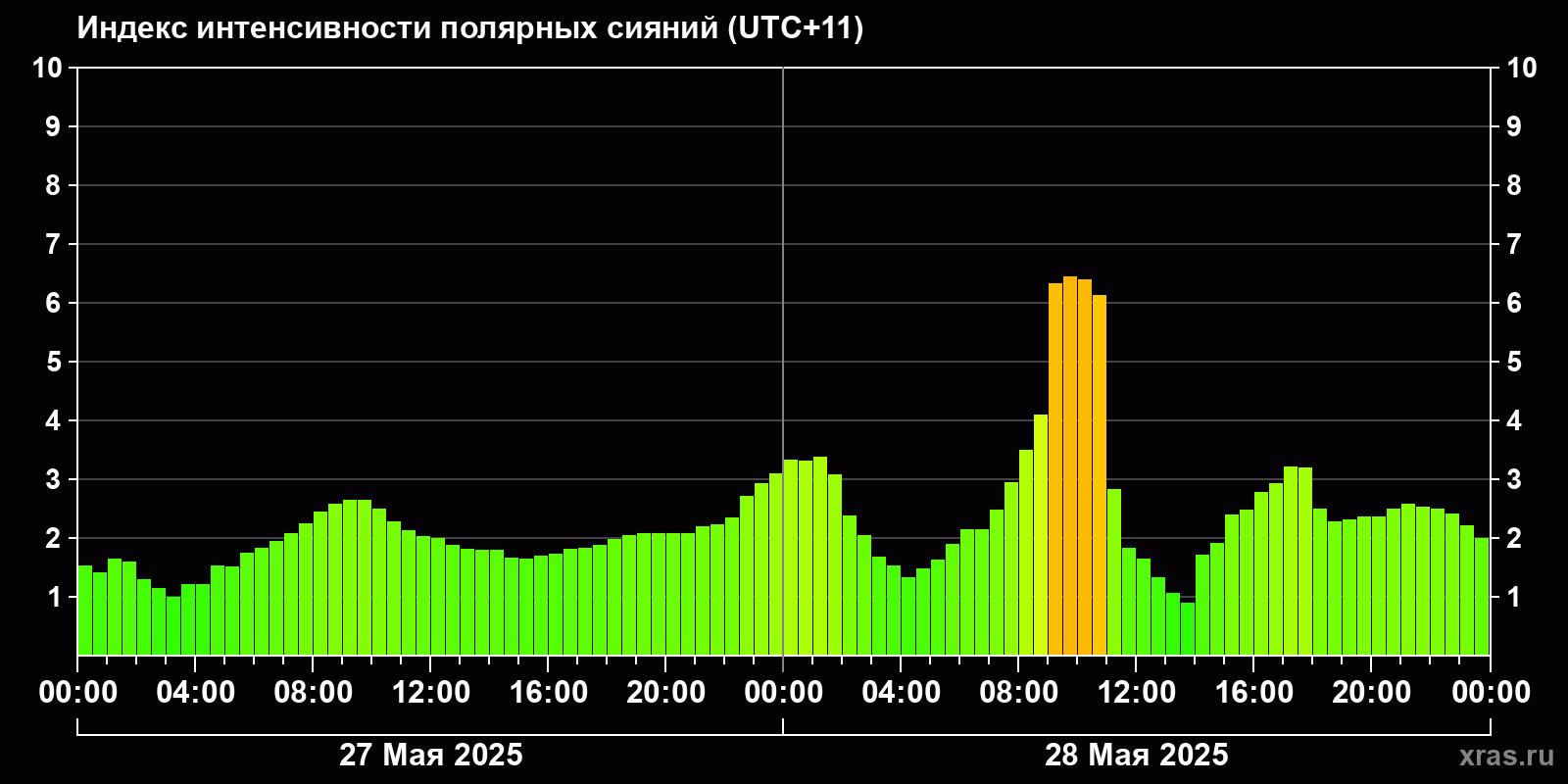 Изменения индекса интенсивности полярных сияний с 2025-05-27 по 2025-05-28 по местному времени