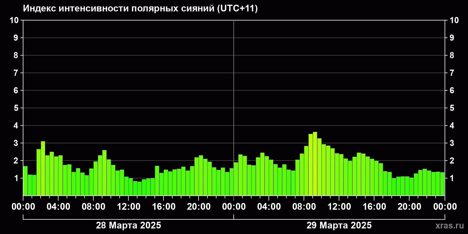 Изменения индекса интенсивности полярных сияний с 2025-03-28 по 2025-03-29 по местному времени