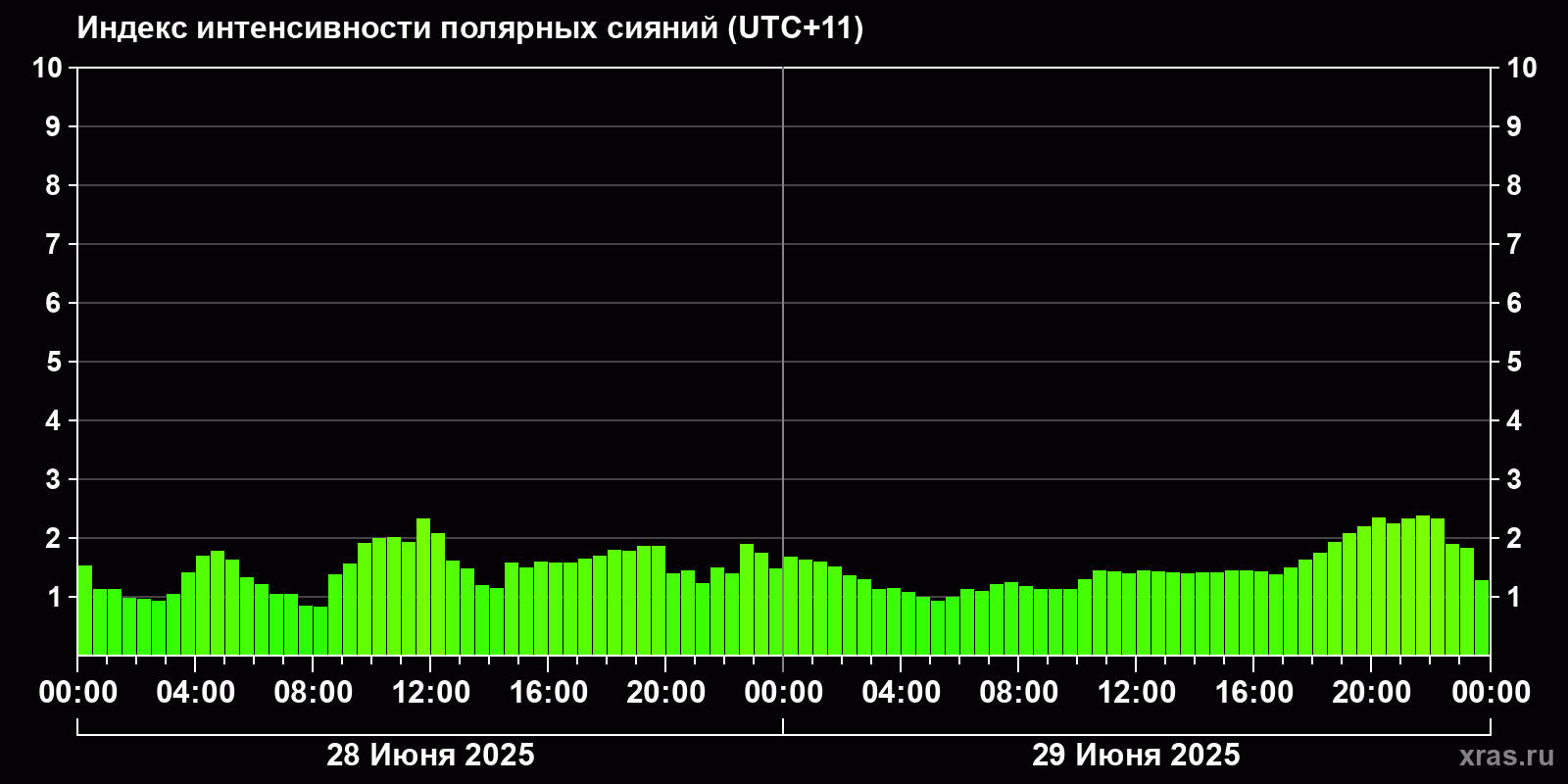 Изменения индекса интенсивности полярных сияний с 2025-06-28 по 2025-06-29 по местному времени