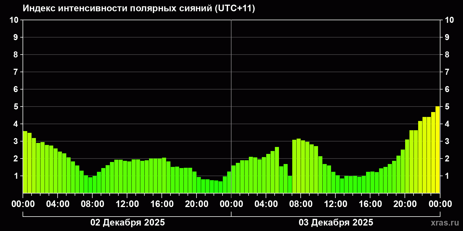 Изменения индекса интенсивности полярных сияний с 2025-12-02 по 2025-12-03 по местному времени