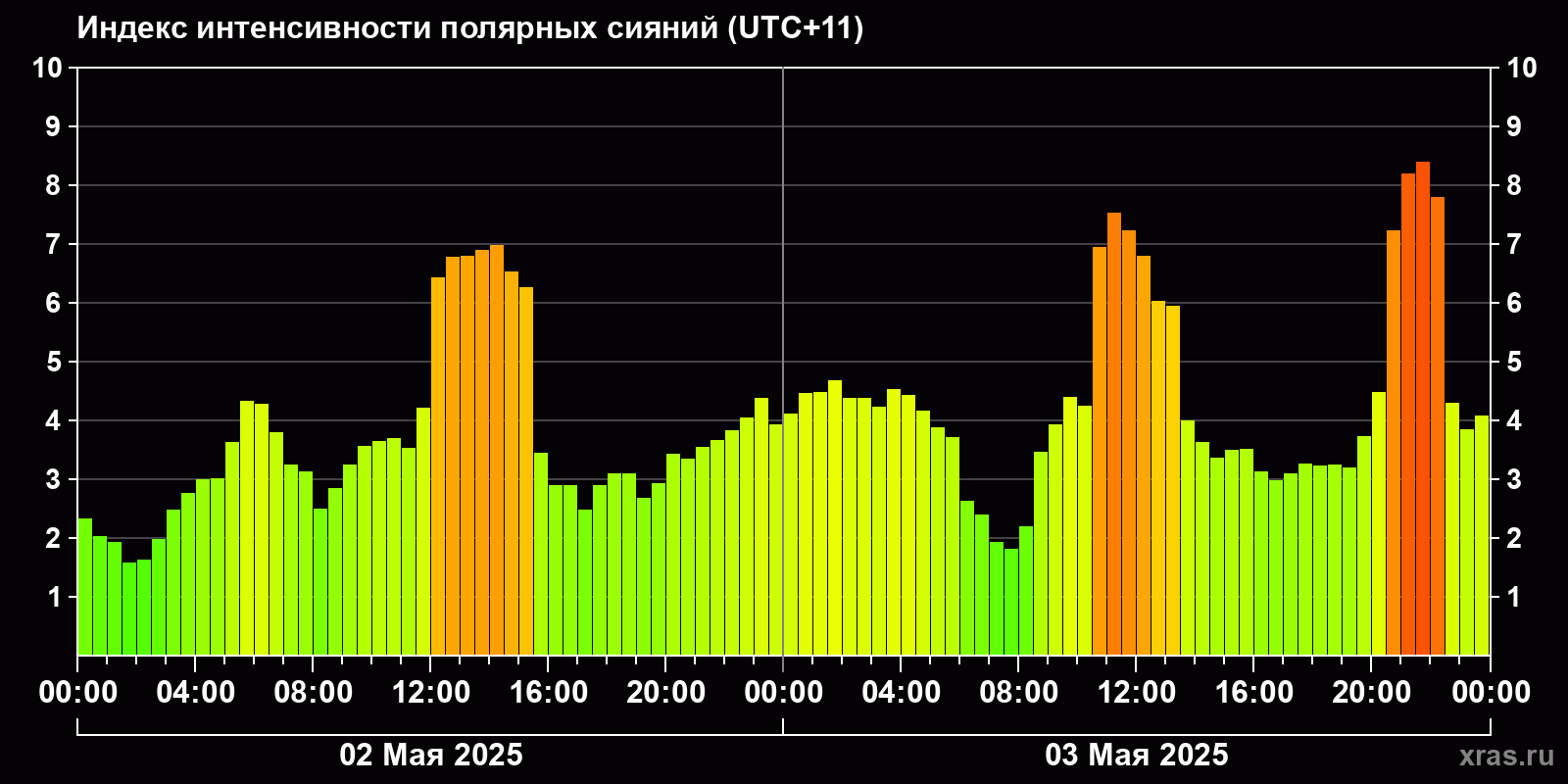 Изменения индекса интенсивности полярных сияний с 2025-05-02 по 2025-05-03 по местному времени