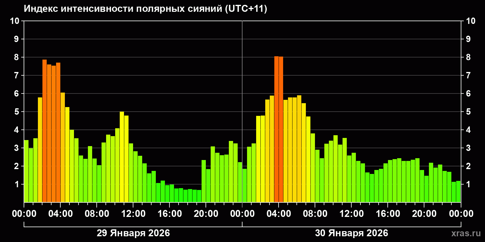 Изменения индекса интенсивности полярных сияний с 2026-01-29 по 2026-01-30 по местному времени