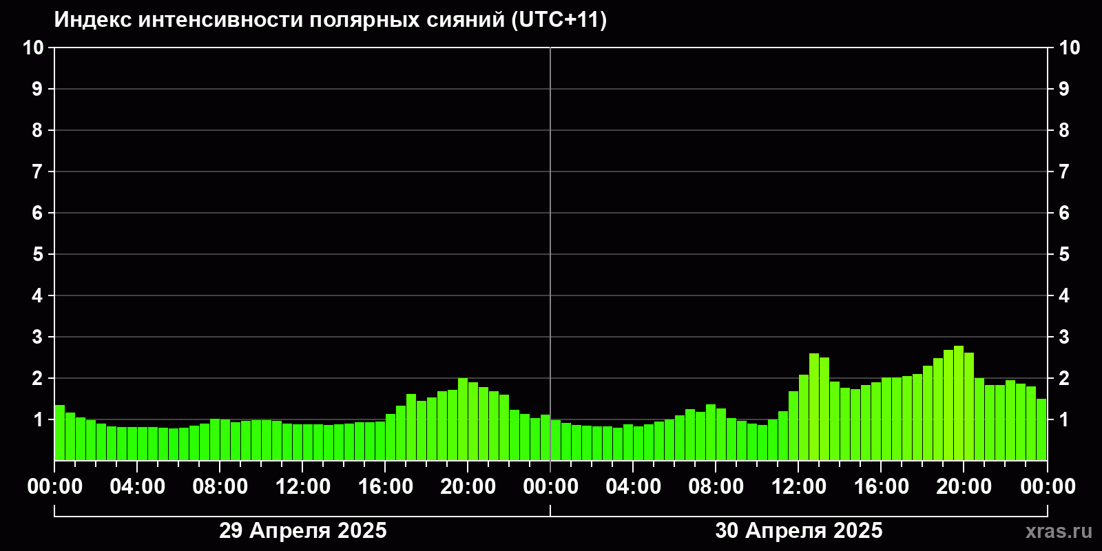 Изменения индекса интенсивности полярных сияний с 2025-04-29 по 2025-04-30 по местному времени