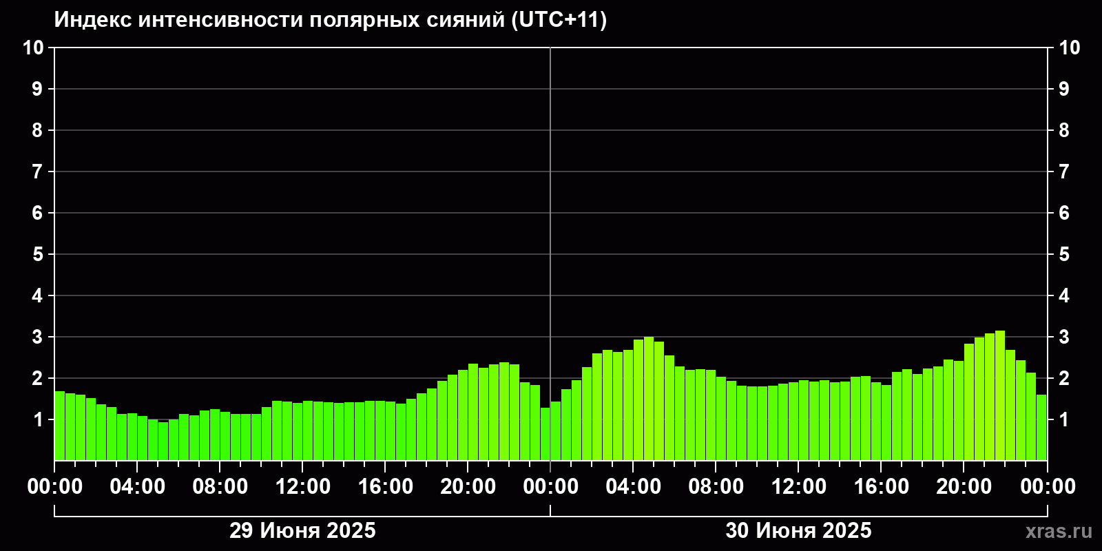 Изменения индекса интенсивности полярных сияний с 2025-06-29 по 2025-06-30 по местному времени