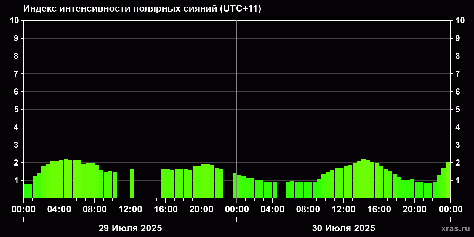 Изменения индекса интенсивности полярных сияний с 2025-07-29 по 2025-07-30 по местному времени