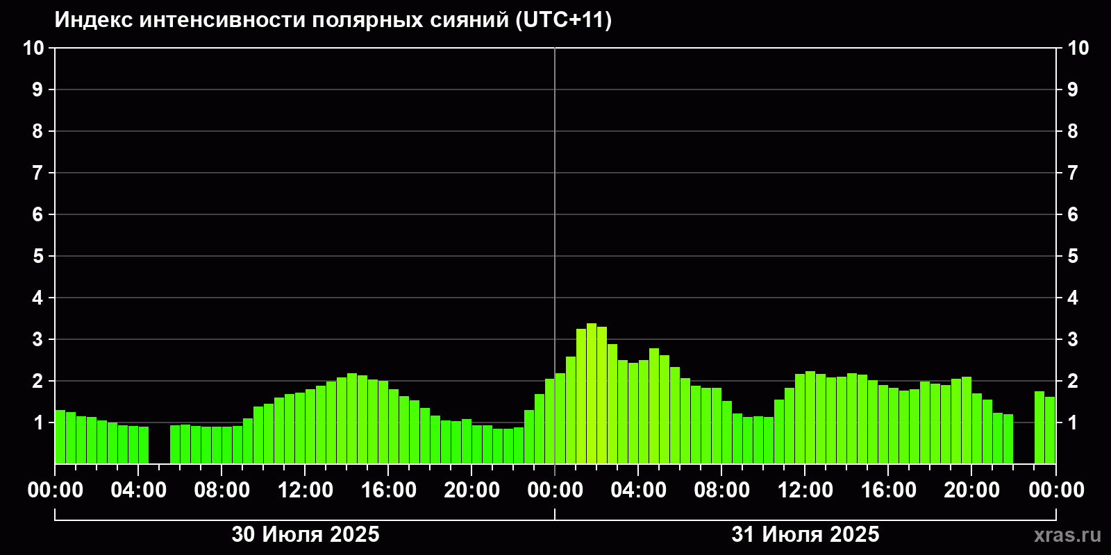 Изменения индекса интенсивности полярных сияний с 2025-07-30 по 2025-07-31 по местному времени