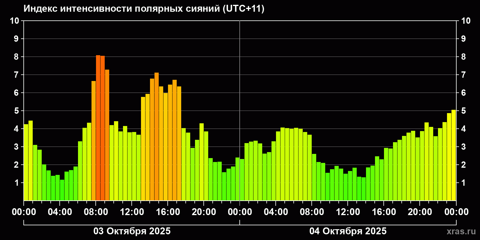Изменения индекса интенсивности полярных сияний с 2025-10-03 по 2025-10-04 по местному времени