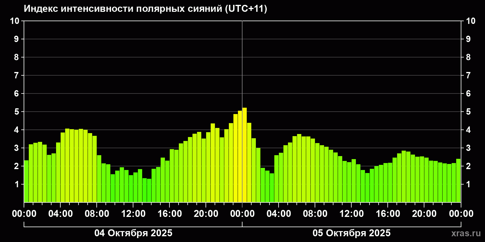 Изменения индекса интенсивности полярных сияний с 2025-10-04 по 2025-10-05 по местному времени