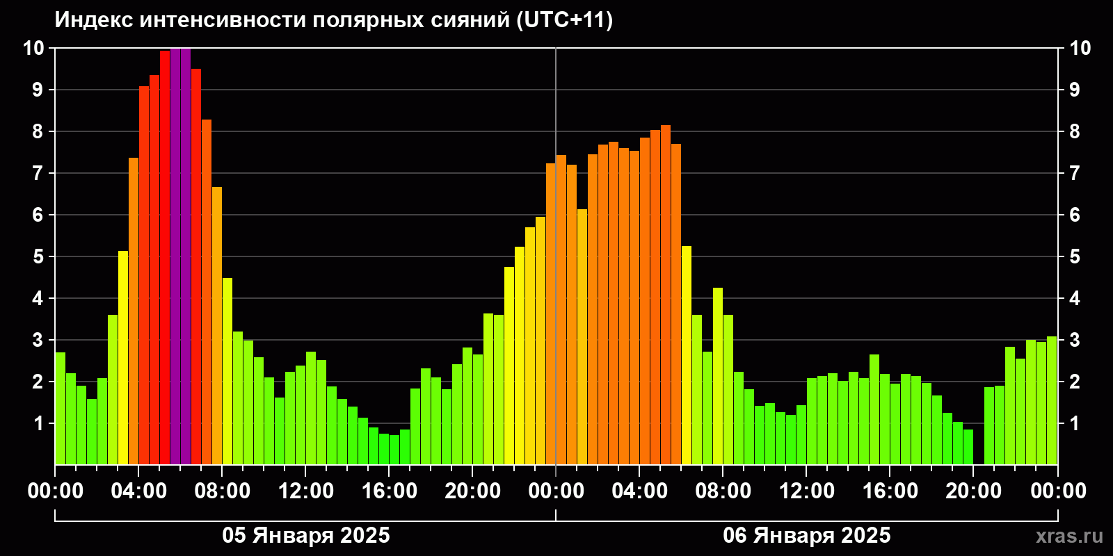 Изменения индекса интенсивности полярных сияний с 2025-01-05 по 2025-01-06 по местному времени