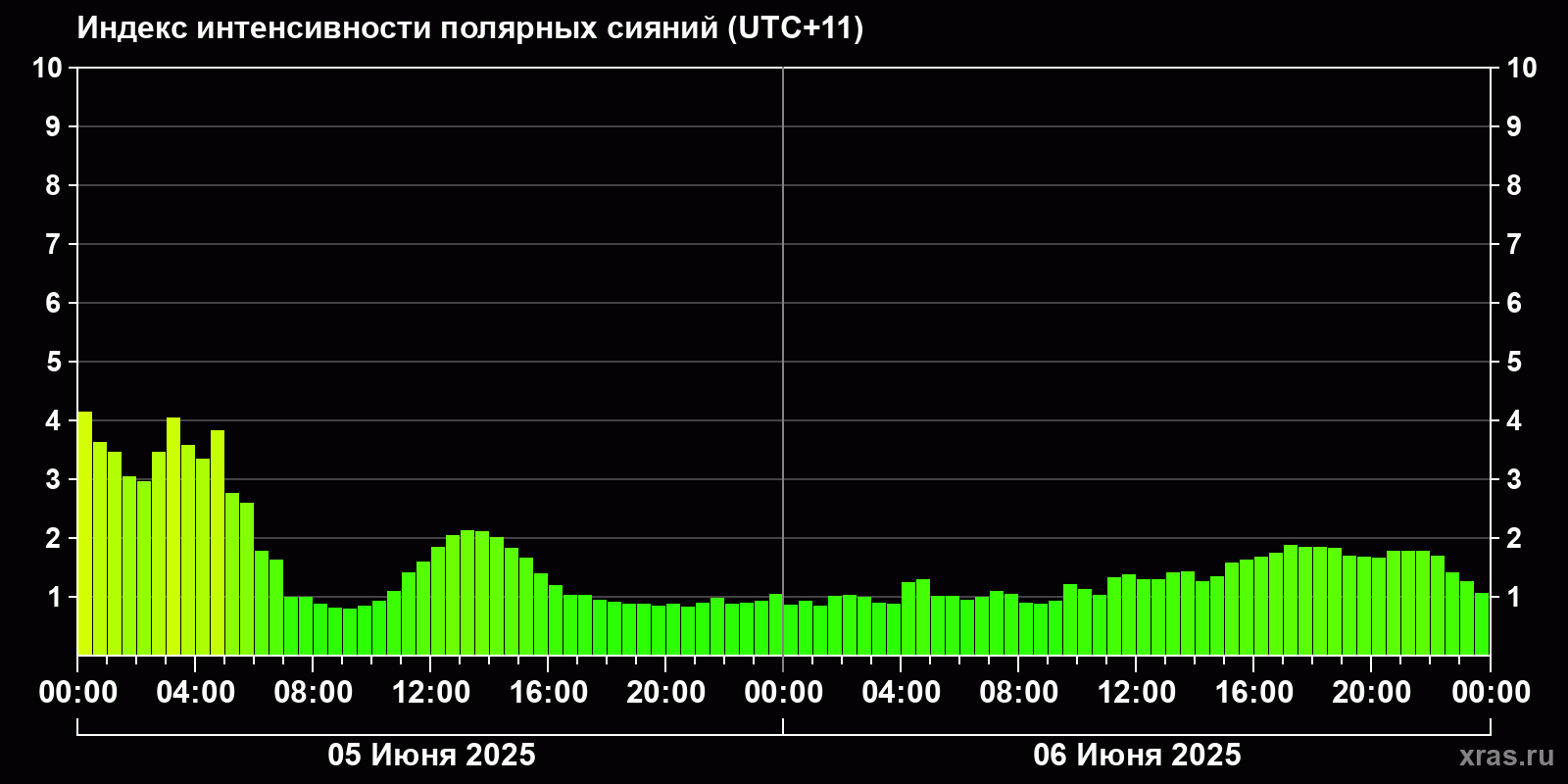 Изменения индекса интенсивности полярных сияний с 2025-06-05 по 2025-06-06 по местному времени