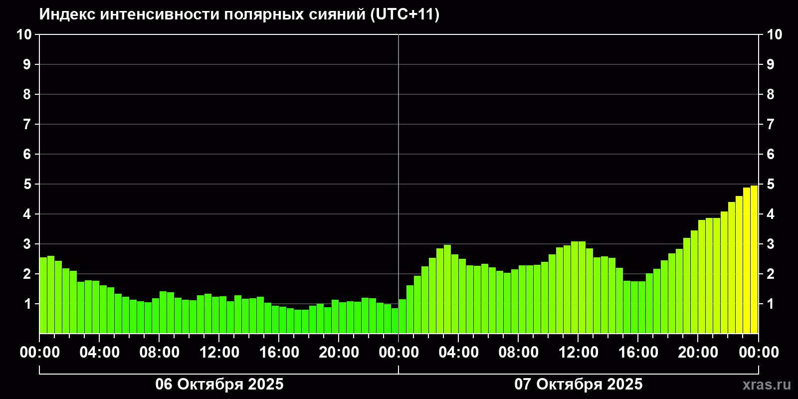 Изменения индекса интенсивности полярных сияний с 2025-10-06 по 2025-10-07 по местному времени