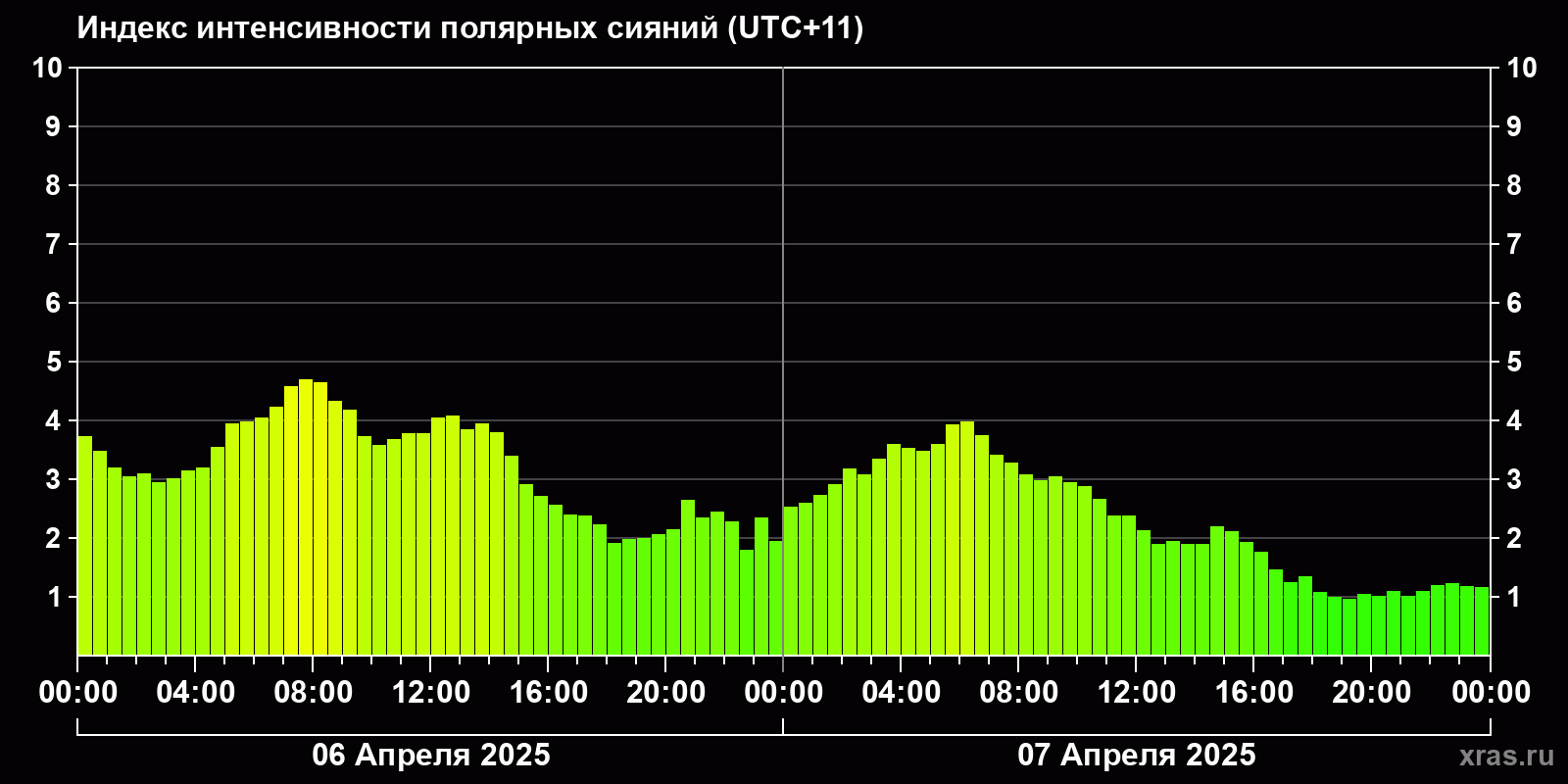 Изменения индекса интенсивности полярных сияний с 2025-04-06 по 2025-04-07 по местному времени