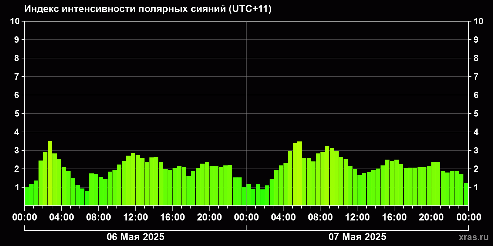 Изменения индекса интенсивности полярных сияний с 2025-05-06 по 2025-05-07 по местному времени