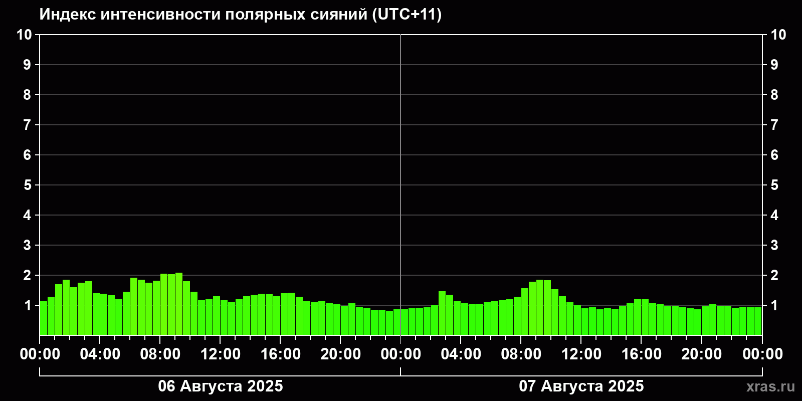 Изменения индекса интенсивности полярных сияний с 2025-08-06 по 2025-08-07 по местному времени