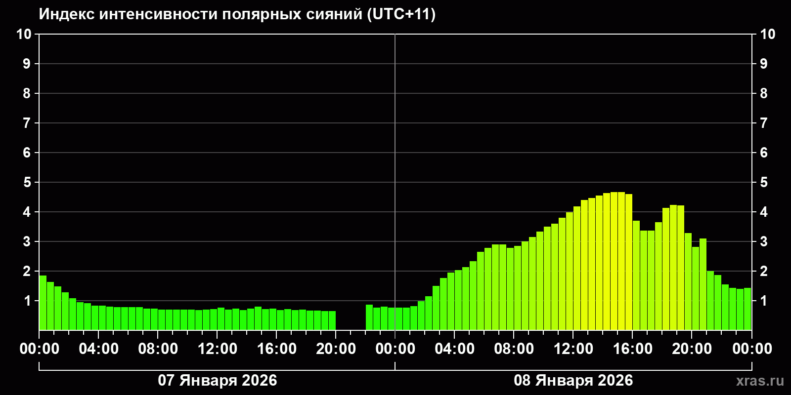 Изменения индекса интенсивности полярных сияний с 2026-01-07 по 2026-01-08 по местному времени