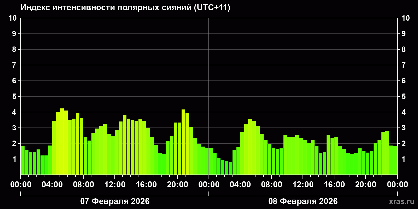 Изменения индекса интенсивности полярных сияний с 2026-02-07 по 2026-02-08 по местному времени