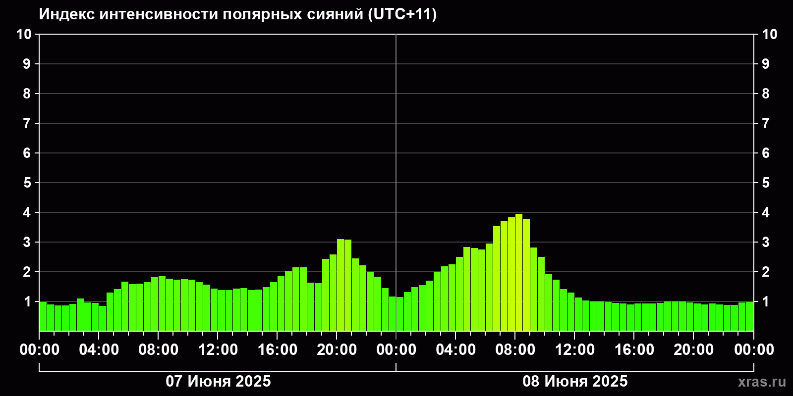 Изменения индекса интенсивности полярных сияний с 2025-06-07 по 2025-06-08 по местному времени